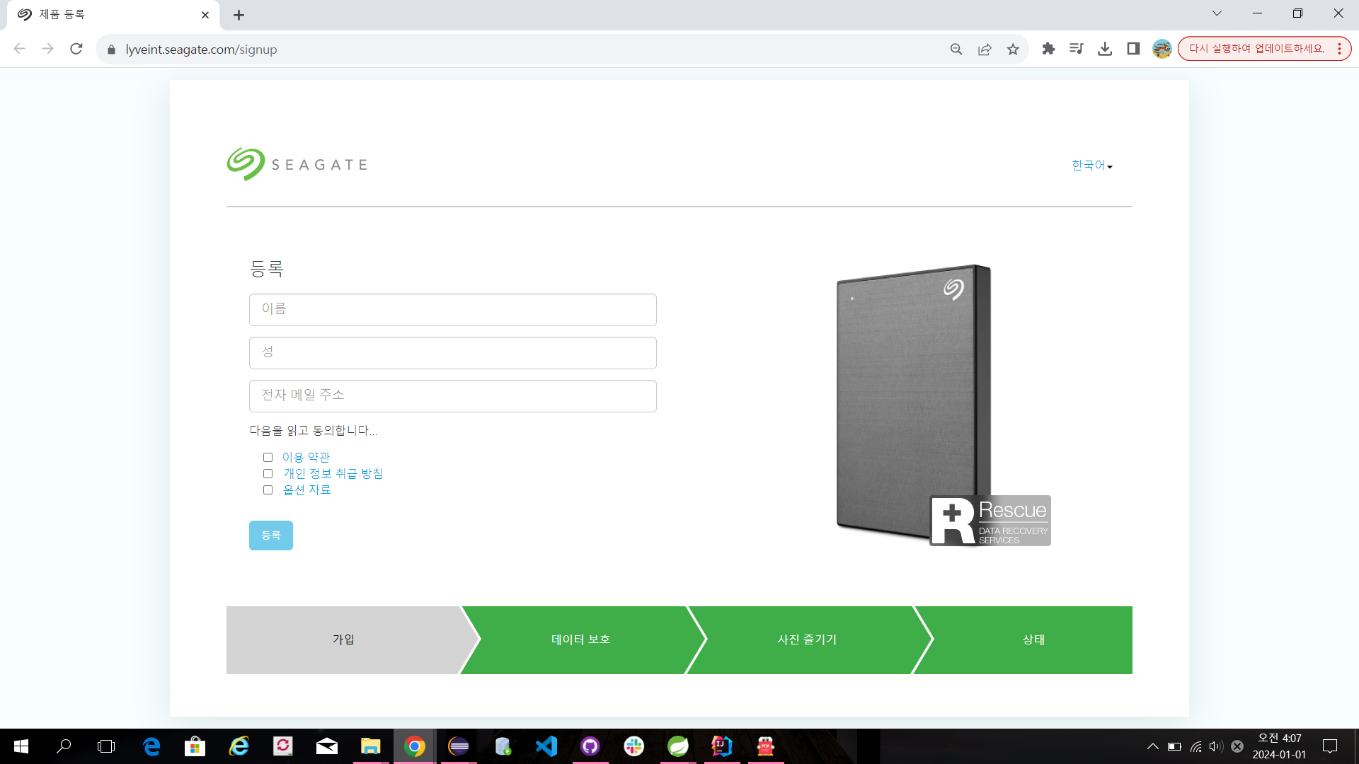입력 후 이용약관과 개인정보취급방침 동의하고 등록