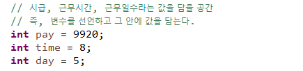 int pay; (자료형(변수타입) 변수) 이게 변수 선언.