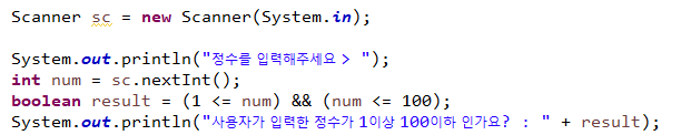 AND연산자 예시 : 사용자에게 정수값을 입력받아서 1이상 100이하인지 확인해보기 !!!