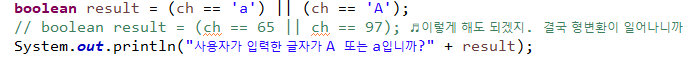 OR연산자 : 사용자가 입력한 값이 'A' 또는 'a'인지 확인!